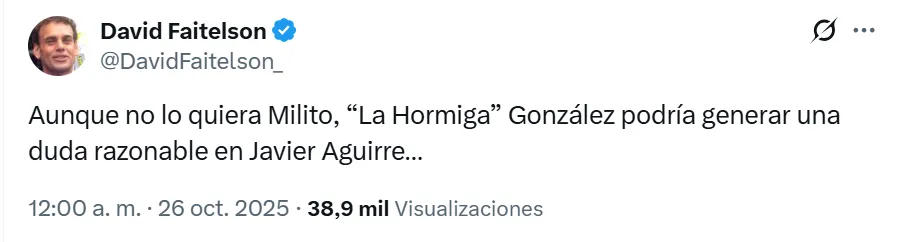 “Aunque no lo quiera Milito, ‘La Hormiga’ González podría generar una duda razonable en Javier Aguirre…”, expresó el periodista, destacando al atacante que podría meterle presión a los demás delanteros que están en consideración del entrenador del seleccionado mexicano.