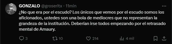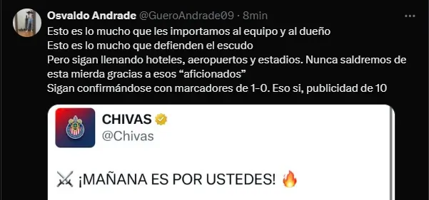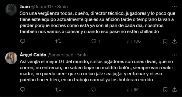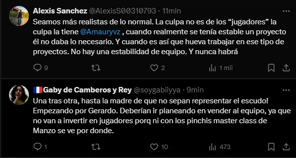 Otros incluso marcaron a los responsables: “Una tras otra, hasta la madre de que no sepan representar el escudo! Empezando por Gerardo. Deberían ir planeando en vender al equipo, ya que no van a invertir en jugadores porque ni con los pinchis master class de Manzo se ve por donde”.