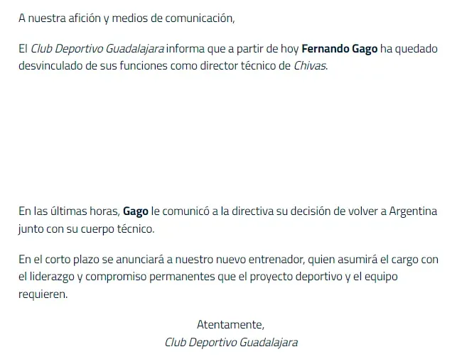 El club dio a conocer, por medio de su sitio oficial, la decisión del estratega de poner fin a su ciclo en Guadalajara por medio de la activación de su cláusula de salida. “A partir de hoy Fernando Gago ha quedado desvinculado de sus funciones como director técnico. En las últimas horas, Gago le comunicó a la directiva su decisión de volver a Argentina junto con su cuerpo técnico. En el corto plazo se anunciará a nuestro nuevo entrenador, quien asumirá el cargo con el liderazgo y compromiso permanentes que el proyecto deportivo y el equipo requieren“, escribió la institución en una nota en la plataforma, que luego compartió en sus redes sociales.