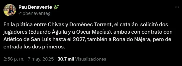 El español solicitó a dos jugadores con contrato vigente en San Luis hasta 2027: Eduardo Águila y Óscar Macías. Ambos son prioridad para Torrent, ya que los conoce bien y confía en lo que pueden aportar. Además, pidió la llegada del joven Ronaldo Nájera.