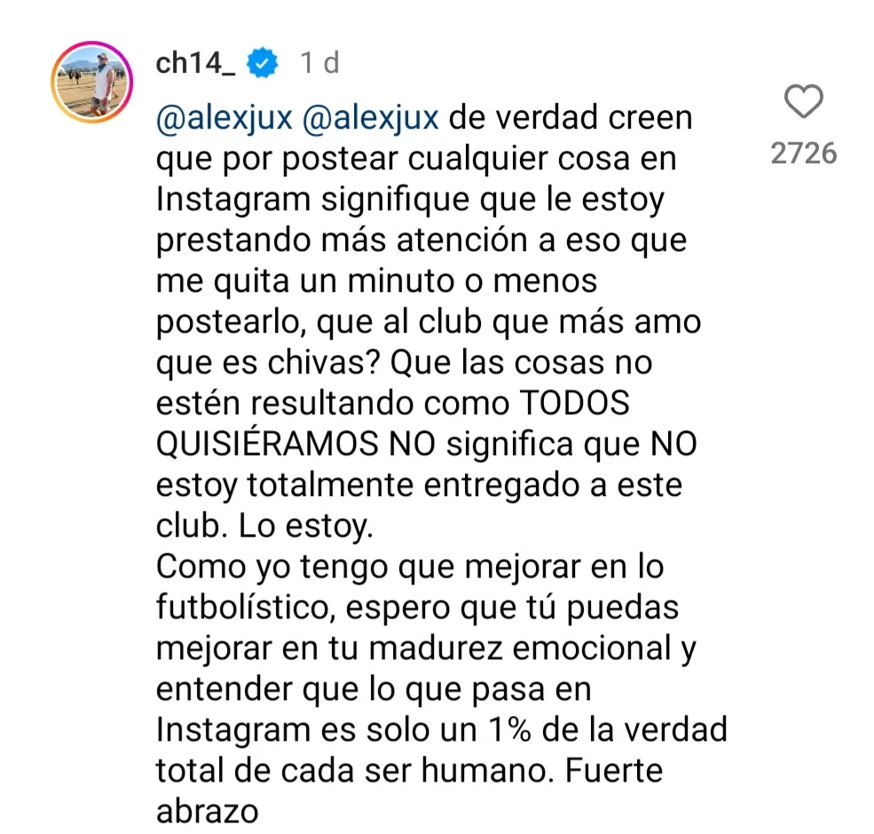 “¿De verdad creen que por postear cualquier cosa en Instagram signifique que le estoy prestando más atención a eso que me quita un minuto o menos postearlo, que al club que más amo que es Chivas? Que las cosas no estén resultando como todos quisiéramos no significa que no estoy totalmente entregado a este club. Lo estoy”, respondió.