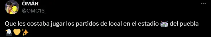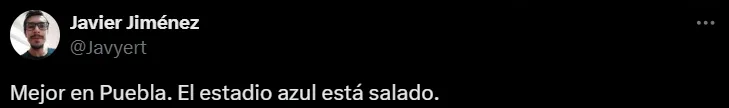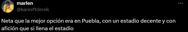 Al respecto, uno de los simpatizantes escribió: “Neta que la mejor opción era Puebla, con un estadio decente y una afición que sí llena el estadio”. Asimismo, en esa línea otros agregaron: “Qué les costaba jugar los partidos de local en el estadio de Puebla”, “era en Puebla, ese estadio deprime nada más de verlo” y “mejor en Puebla. El estadio azul está salado”.