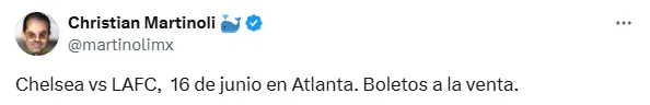 “Chelsea vs LAFC, 16 de junio en Atlanta. Boletos a la venta”, escribió Christian Martinoli en su cuenta de X (ex Twitter). El comunicador se burló del América de manera indirecta al hablar de los tickets sobre el debut de LAFC contra el Chelsea en el Mundial de Clubes.