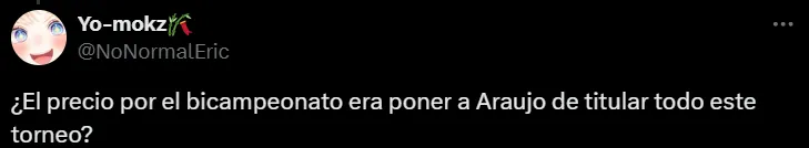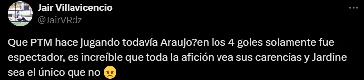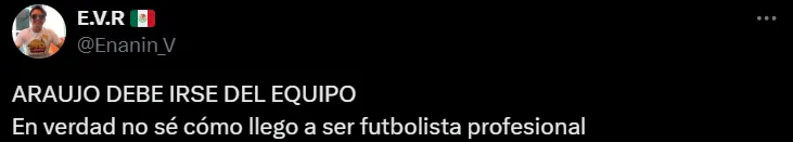 “Araujo debe irse del equipo, en verdad no sé cómo llegó a ser futbolista profesional”, “en los 4 goles fue espectador, es increíble que toda la afición vea sus carencias y Jardine sea el único que no”, “¿El precio por el bicampeonato era poner a Araujo de titular todo este torneo” y “fuera Araujo”, escribieron algunos de los simpatizantes del América en X (ex Twitter).
