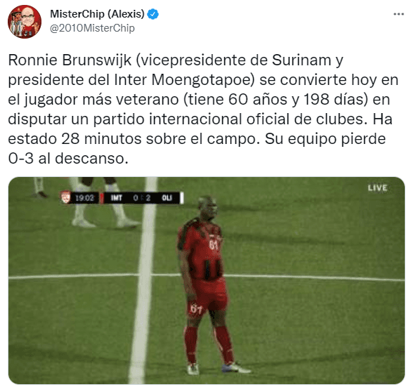 Ronnie Brunswijk, vicepresidente de Surinam, se convirtió esta tarde en el futbolista más veterano en jugar como titular un encuentro oficial en la Concacaf League, en el encuentro que disputaron el Inter Moengotapoe de su país ante el conocido Olimpia de Honduras, por la ida de los octavos de final del certamen internacional.