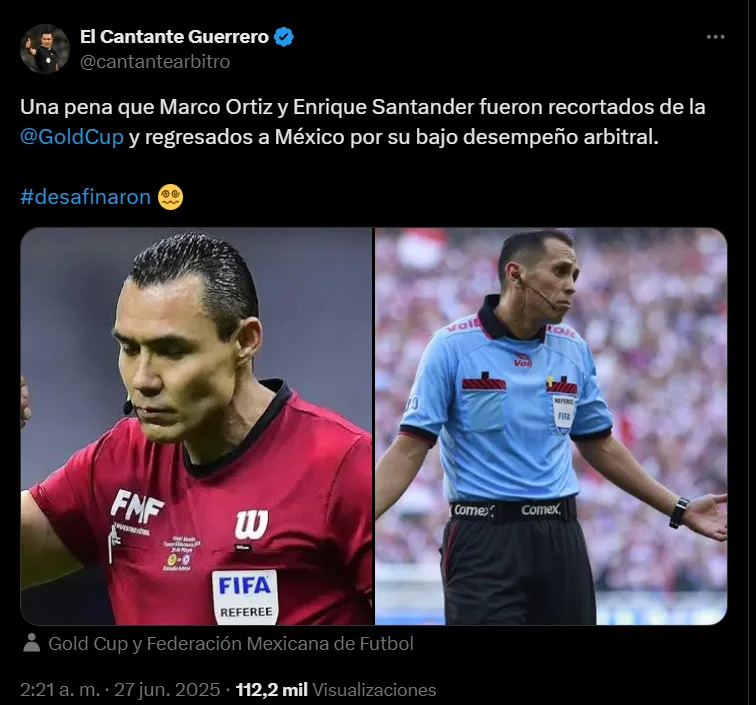 El ex árbitro Fernando Guerrero fue uno de los que confirmó públicamente lo sucedido a través de sus redes sociales. “Una pena que Marco Ortiz y Enrique Santander fueron recortados de la Copa Oro y regresados a México por su bajo desempeño arbitral”.