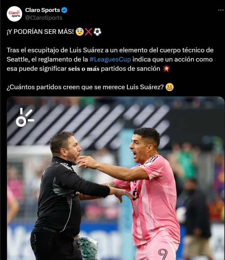 Según informaron en Claro Sports, el reglamento establece que por una acción como la de Suárez, este podría recibir una sanción de seis o más partidos. Ahora todo dependerá de la decisión que tome la Concacaf con el atacante de Inter Miami.