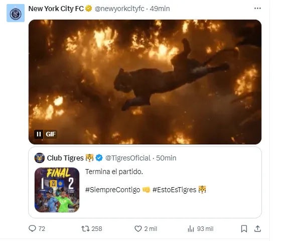 Luego del partido de octavos de final, New York City FC utilizó su cuenta oficial de X (ex Twitter) para realizar bromas hacia Tigres e incluso usó memes tras eliminar al equipo de Paunovic.