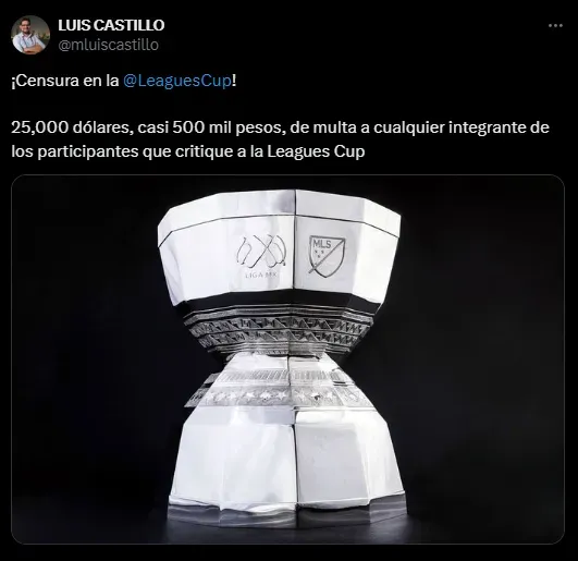 La multa a pagar por quienes osen criticar a la Leagues Cup será de ¡25.000 dólares!, equivalente a 450 mil pesos mexicanos, una verdadera locura y más considerando el motivo por el cual se atribuiría tal castigo al apuntado. Un despropósito que atenta contra los distintos puntos de vistaque puedan tener todos y cada uno de los integrantes de los 47 clubes que buscarán el título.