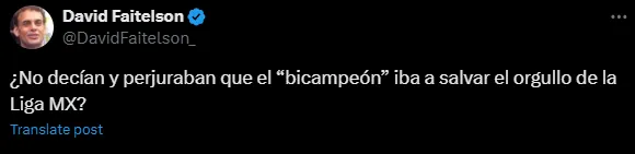 “¿No decían y perjuraban que el ‘bicampeón’ iba a salvar el orgullo de la Liga MX?”, escribió el comunicador de TUDN en la mencionada red social. Posteriormente, la publicación recibió distintas opiniones de usuarios que se mostraron a favor y en contra de lo escrito por el periodista.