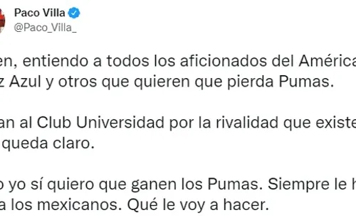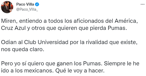 “Miren, entiendo a todos los aficionados del América, Cruz Azul y otros que quieren que pierda Pumas.Odian al Club Universidad por la rivalidad que existe, nos queda claro.Pero yo sí quiero que ganen los Pumas. Siempre le he ido a los mexicanos. Qué le voy a hacer“, escribió en sus redes sociales.