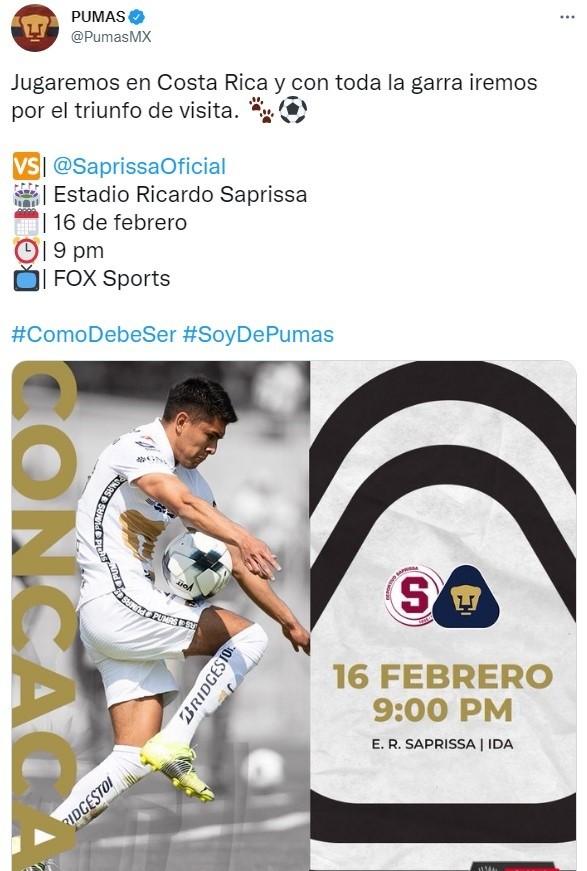 SaprissayPumas UNAMse enfrentarán HOY,miércoles 16 de febrero. El duelo entre ambas escuadras está pactado a las 21:00 horas (hora de México) y tendrá lugar en el Estadio Ricardo Saprissa.