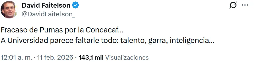 “Fracaso de Pumas por la Concacaf… A Universidad parece faltarle todo: talento, garra, inteligencia…”, escribió Faitelson, encendiendo nuevamente el debate entre los aficionados, como suele ocurrir con sus publicaciones más polémicas.
