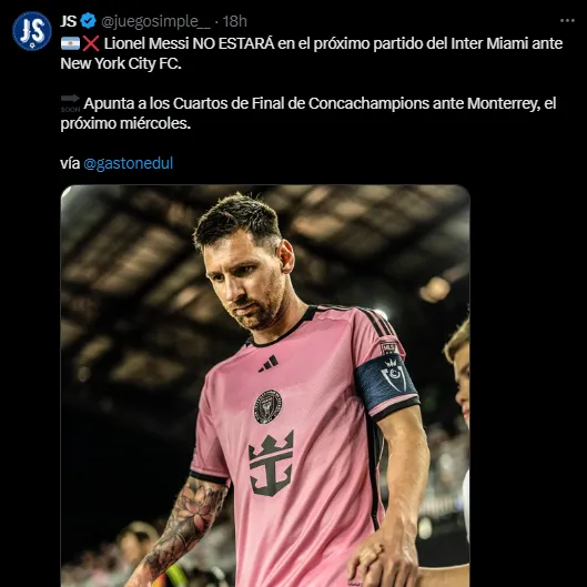 Así, según el reporte del periodista argentino Gastón Edul, en una decisión conjunta entre jugador y entrenador, se tomó la determinación de que Lionel Messi no juegue ante el New York y se guarde para Rayados, rival al que enfrentará entre semana.
