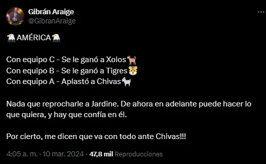En este escenario, según informó el periodista Gibrán Araige, lejos de dar por definida la serie y especular con el abultado resultado de la ida fuera de casa, el DT piensa “ir con todo” ante Chivas, en la revancha de octavos.