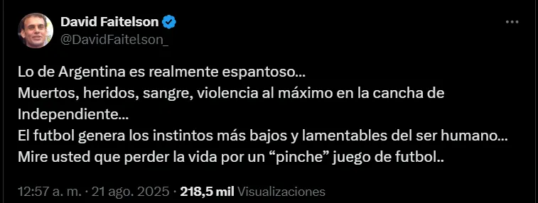 David Faitelson, periodista mexicano, opinó sobre lo sucedido y criticó al futbol sudamericano luego de los hechos violentos en Argentina: “El futbol sudamericano que tanto veneramos…”, comenzó.