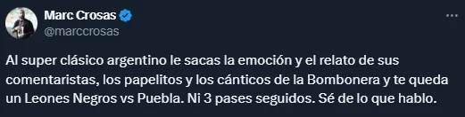 “Al superclásico argentino le sacas la emoción y el relato de sus comentaristas, los papelitos y los cánticos de la Bombonera y te queda un Leones Negros vs Puebla. Ni 3 pases seguidos. Sé de lo que hablo”, publicó Marc en las redes sociales, generando comentarios divididos.