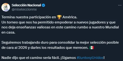 “Termina nuestra participación en Copa América. Un torneo que nos ha permitido empoderar a nuevos jugadores y que nos deja enseñanzas valiosas en este camino rumbo a nuestro Mundial en casa. Seguiremos trabajando duro para consolidar la mejor selección posible de cara al 2026 y darles los resultados que merecen. Nadie dijo que el camino sería fácil”, escribieron desde la cuenta del Tri.