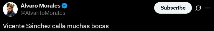 Uno de los que dio cuenta de esta situación fue Álvaro Morales, periodista de ESPN, quien a través de un sucinto mensaje en su cuenta personal de X (ex Twitter) aseguró: “Vicente Sánchez calla muchas bocas”. De esta manera, el reconocido comunicador continúa apoyando el proyecto del ex futbolista se Toluca en la institución luego de que en febrero pasado dijera que era la mejor opción para comandar los destinos de la institución cementera.
