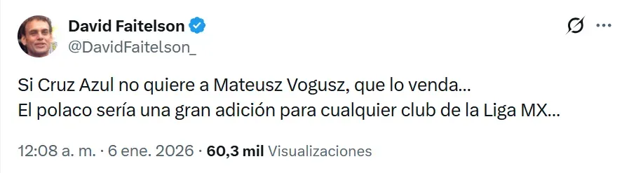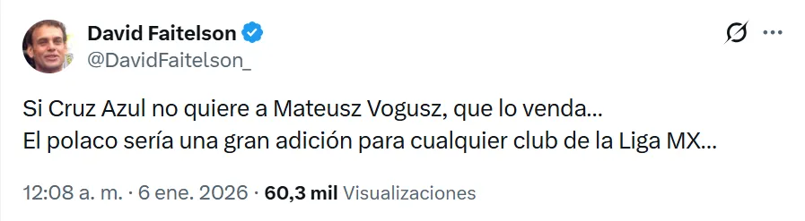 El comentarista escribió en su cuenta de X: “Si Cruz Azul no quiere a Mateusz Bogusz, que lo venda… El polaco sería una gran adición para cualquier club de la Liga MX…”. Con este mensaje, Faitelson deja claro que considera que el mediocampista puede aportar mucho, pero solo si tiene continuidad en un equipo que lo valore.