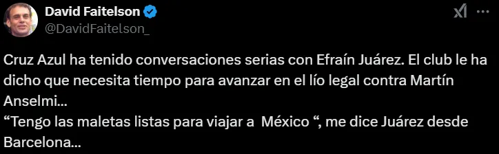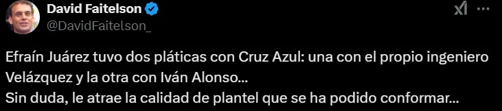 En adición a esto, el mencionado comunicador reveló que Efraín Juárez platico con Víctor Velázquez, presidente de Cruz Azul, y con Iván Alonso, director deportivo de la institución, y que se sintió atraído por la plantilla de La Máquina. De todas formas, agregó que el club le informó que aún debe solucionar el “lío legal” suscitado tras la salida de Martín Anselmi.
