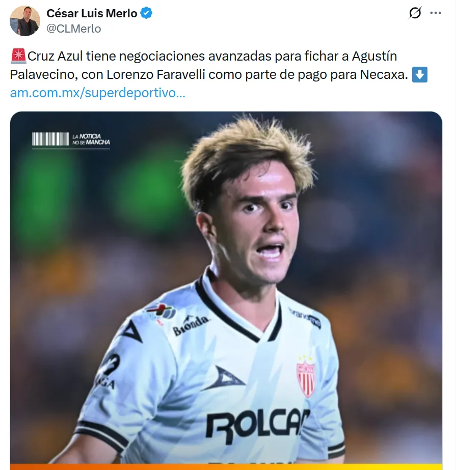 De acuerdo a lo informado por César Luis Merlo en Súper Deportivo, está todo dado para que Agustín Palavecino se convierta en nuevo refuerzo de Cruz Azul. Como parte de la negociación, Lorenzo Faravelli entraría como moneda de cambio y pasaría a Necaxa, además de una suma de dinero que pondrá el club cementero.