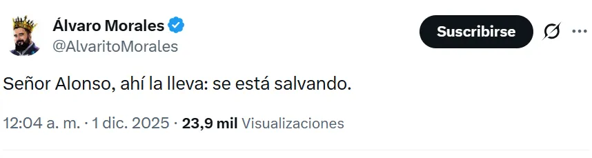 “Señor Alonso, ahí la lleva: se está salvando”, escribió en sus redes, dejando en claro que, para él, el puesto del directivo podría haber quedado en entredicho si La Máquina quedaba eliminada, especialmente por la plantilla con la que cuentan y las expectativas que existen sobre el equipo.