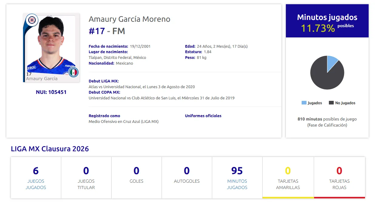 - Amaury García, volante de 24 años, suma 95 minutos disputados en el torneo Clausura 2026.