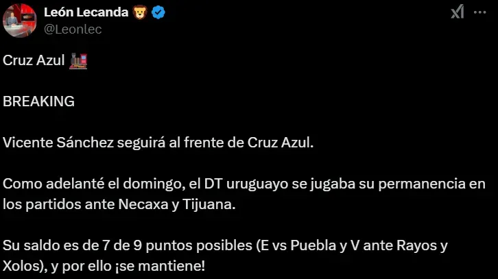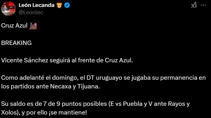El triunfo en Baja California significó también un importante espaldarazo para Vicente Sánchez, quien quedará a cargo del banquillo celeste de manera definitiva tras la salida del estratega argentino. Según reveló el periodista León Lecanda, de ESPN, la directiva capitalina ha quedado conforme con los resultados obtenidos por el uruguayo de 45 años durante sus tres partidos dirigidos y, por ende, ha decidido que continúe en su puesto.