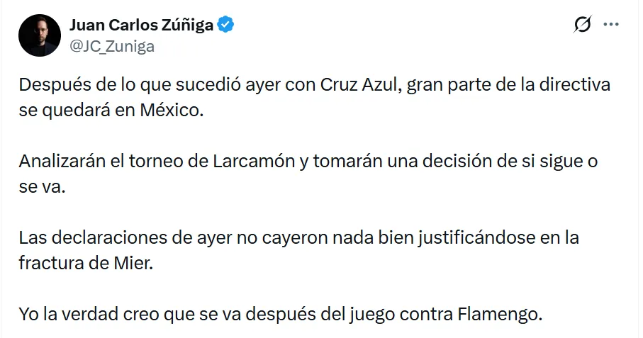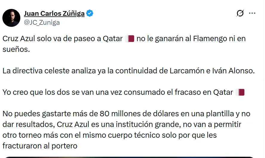 Zuñiga agregó que Cruz Azul llega sin confianza a Qatar para disputar la Copa Intercontinental y será difícil competir ante Flamengo: “Cruz Azul solo va de paseo a Qatar no le ganarán al Flamengo ni en sueños. La directiva celeste analiza ya la continuidad de Larcamón e Iván Alonso. Yo creo que los dos se van una vez consumado el fracaso en Qatar”, aseguró.