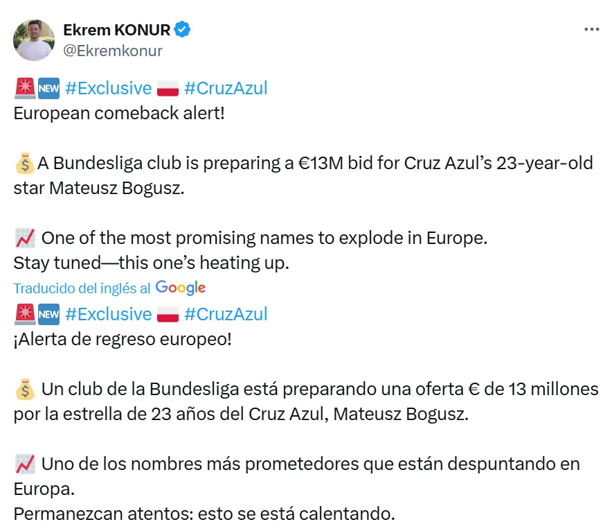 Aunque en las últimas horas llegó una mala noticia para el equipo ya que hay un interés desde Europa por una de sus figuras y su salida podría darse en este mercado de pases, pero también dependerá de la postura que tome la directiva del equipo mexicano.