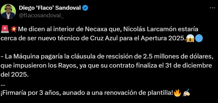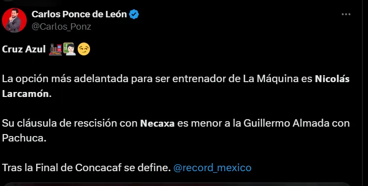 De acuerdo a la información de Carlos Ponce de León, periodista de Récord, el caso de Larcamón es más accesible por dos motivos: conoce bien la Liga MX y su cláusula es más baja. Según el reportero Diego Sandoval, Cruz Azul tendría que pagar 2,5 millones de dólares para sacarlo de Necaxa, donde su contrato finaliza en diciembre.