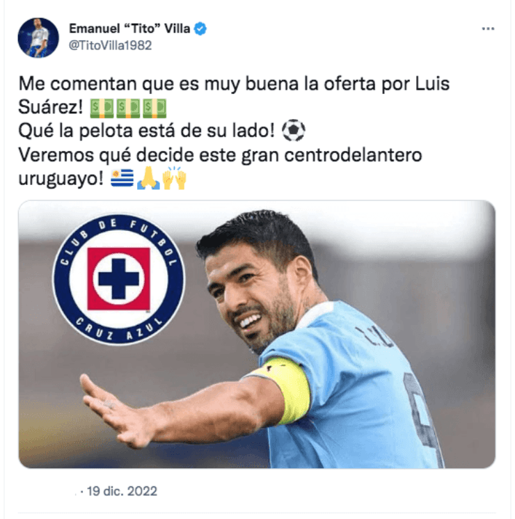 Emanuel Villa, exfutbolista de Cruz Azul, reveló que Suáreztiene una muy buena propuesta sobre la mesa por parte de los Cementeros y asegura que ahora la última palabra la tiene el atacante sudamericano de 36 años.