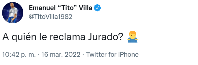 “A quién le reclama Jurado”, escribió Villa en su cuenta de Twitter ante el error del portero. Y es que después del gol del ‘Impact’, el cancerbero comenzó a protestar gesticulando como queriendo disimular lo sucedido. Para su fortuna, dicho tanto no terminó costando la clasificación.