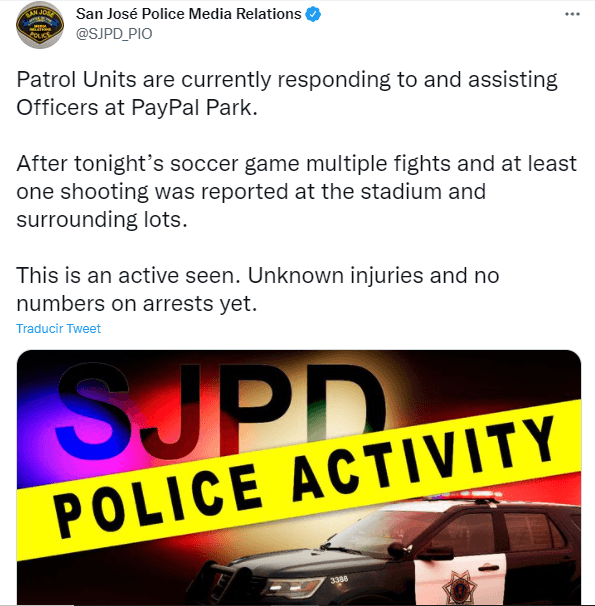 La policía de San José informó que después del encuentro detuvieron a cinco aficionados debido a distintos focos de pelea en las inmediaciones del PayPal Park. Incluso, se produjo un tiroteo en el estacionamiento del estadio de California. El hecho, tristemente, remonta al fallecido hace pocas semanas en Philadelphia.