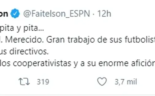 “La Máquina” pita y pita… Está en la final. Merecido. Gran trabajo de sus futbolistas, de su cuerpo técnico y de sus directivos. Felicidades a los cooperativistas y a su enorme afición en todo el país”, escribió en su cuenta oficial de Twitter.