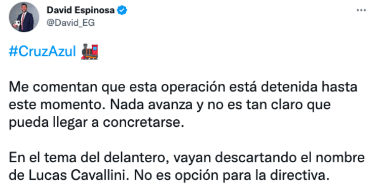 “Me comentan que esta operación está detenida hasta este momento. Nada avanza y no es tan claro que pueda llegar a concretarse. En el tema del delantero, vayan descartando el nombre de Lucas Cavallini. No es opción para la directiva“, publicó el periodista David Espinosa.