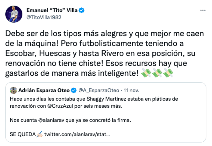 La Máquina llegó a un acuerdo para la extensión del contrato de Shaggy Martínez, algo que provocó la molestia de Emanuel Villa en las redes sociales.”Debe ser de los tipos más alegres y que mejor me caen de la máquina! Pero futbolisticamente teniendo a Escobar, Huescas y hasta Rivero en esa posición, su renovación no tiene chiste! Esos recursos hay que gastarlos de manera más inteligente!”, escribió Tito en su cuenta de Twitter.