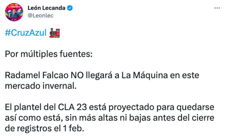 “Por múltiples fuentes: Radamel Falcao NO llegará a La Máquina en este mercado invernal. El plantel del CLA 23 está proyectado para quedarse así como está, sin más altas ni bajas antes del cierre de registros el 1 feb“, escribió Lecanda en su cuenta de Twitter.