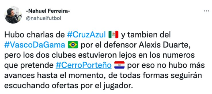 “Hubo charlas de Cruz Azul y también del Vasco Da Gama por el defensor Alexis Duarte, pero los dos clubes estuvieron lejos en los números que pretende Cerro Porteño. Por eso no hubo más avances hasta el momento, de todas formas seguirán escuchando ofertas por el jugador“, escribió Ferreira en su cuenta de Twitter.