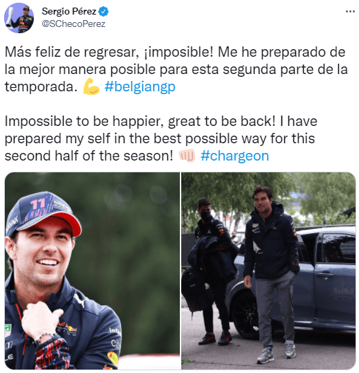 “Más feliz de regresar, ¡imposible! Me he preparado de la mejor manera posible para esta segunda parte de la temporada”, escribió Checo Pérez a través de su Twitter e Instagram junto a dos imágenes del comienzo de su estadía en Bélgica.