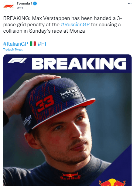 Tiempo después de finalizado el Gran Premio de Monza y el análisis de la colisión, los comisarios determinaron una sanción para Max Verstappen de cara al GP de Rusia, a disputarse en Sochi: “Max Verstappen ha sido sancionado con 3 puestos en la parrilla del #RussianGP, por causar una colisión en la carrera en Monza”.