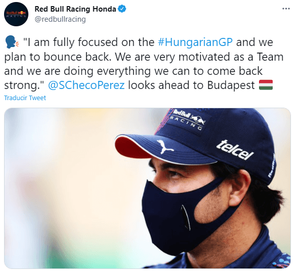 En declaraciones a las redes sociales oficiales de Red Bull Racing, el tapatío dijo estar ilusionado por volver a los grandes desempeños y así ayudar a su escudería: “Estoy completamente concentrado en el Gran Premio de Hungría y planeamos recuperarnos. Estamos muy motivados como equipo y estamos haciendo todo lo posible para volver fuertes”.