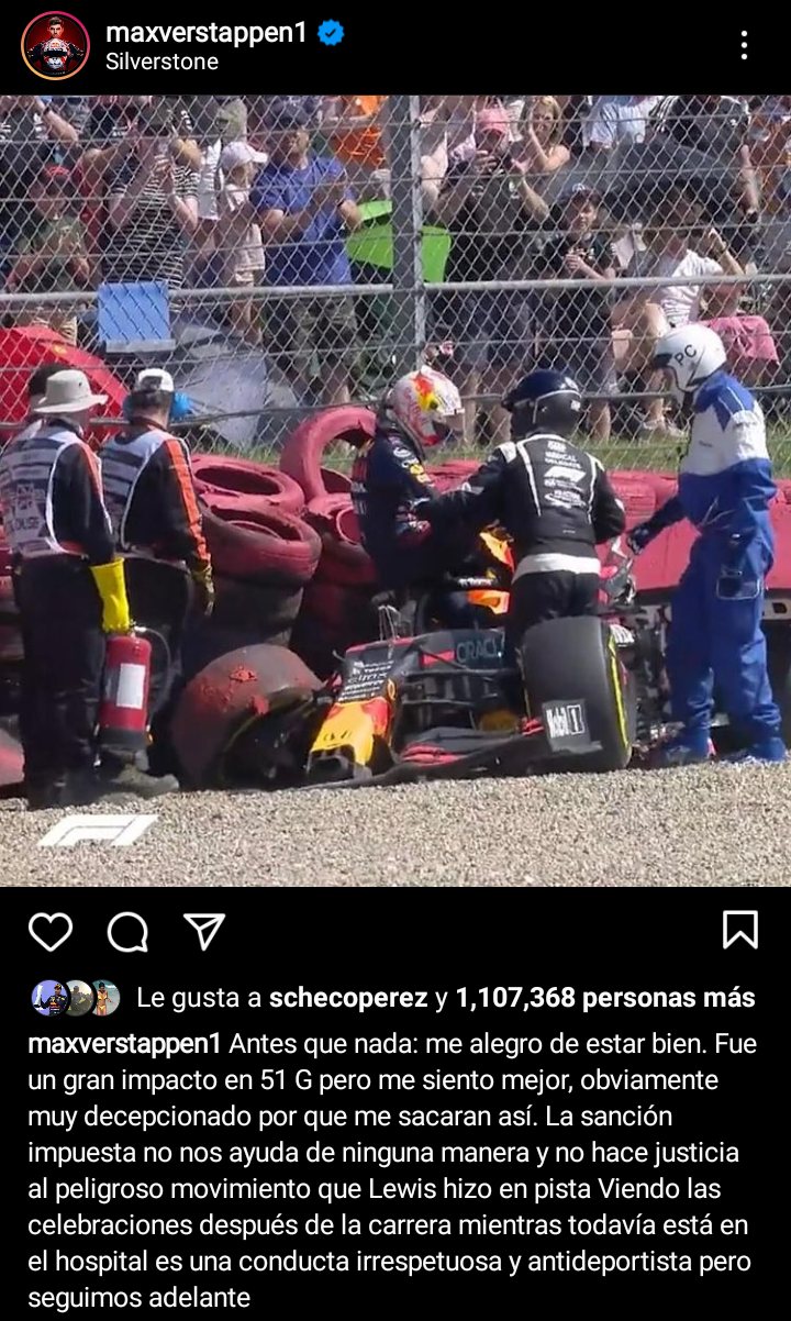 “Antes que nada, me alegro de estar bien. Fue un gran impacto en 51 G pero me siento mejor, obviamente muy decepcionado porque me sacaran así. La sanción impuesta no nos ayuda de ninguna manera y no hace justicia al peligroso movimiento que Lewis hizo en pista. Viendo las celebraciones después de la carrera mientras todavía estoy en el hospital, es una conduca irrespetuosa y antideportiva, pero seguiremos adelante”, fue el duro mensaje de Verstappen en Instagram.