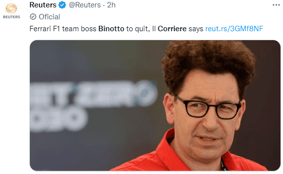 De acuerdo a información de los periodicos La Gazzetta dello Sport y Corriere della Sera, Mattia Binotto ultima detalles para presentar su renuncia al equipo Ferrari. Según la misma fuente, el anuncio de su salida se haría oficial en las próximas horas.