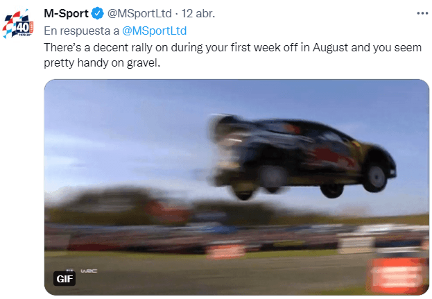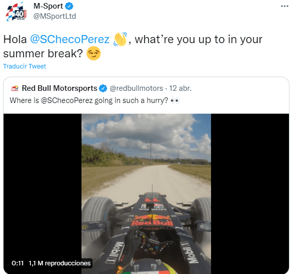 El equipo de M-Sport que dirige Malcolm Wilson citó esta publicación y le escribió al mexicano:“Hola, Sergio Pérez, ¿qué haces en tus vacaciones de verano?”. Yen un nuevo Tweet añadieron: “Hay un respetable rally durante tu primera semana libre en agosto y pareces bastante hábil en la grava”.