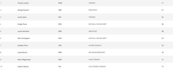 Así las cosas, Charles Leclerc de Ferrari domina cómodamente la tabla de pilotos con 71 puntos y es escoltado porGeorgeRussell de Mercedes, que tiene 37. La tercera posición también es para Ferrari, de gran inicio de temporada, ya que Carlos Sainz suma un total de 33 unidades. Y la segunda posición obtenida le permitió a Checo Pérez quedarse con la cuarta posición, sumando 30 puntos y superando tanto a Lewis Hamilton (28) como a Max Verstappen (25).