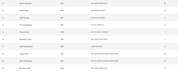 De los pilotos llamados a pelear también por el campeonato, Lewis Hamilton fue cuarto con Mercedes; mientras que Carlos Sainz de Ferrari y Max Verstappen de Red Bull tuvieron que abandonar la carrera. Para el holandés, defensor del título que venía de lograr el primer lugar en el Gran Premio de Arabia Saudita, fue el segundo abandono en tres carreras disputadas.