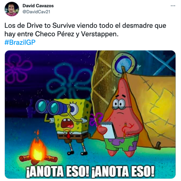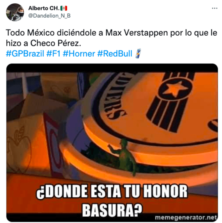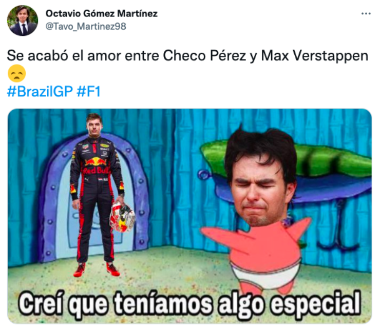 Tras lo sucedido, los aficionados se expresaron en las redes sociales con su insuperable sentido del humor. En Bolavip te presentamos los mejores memes de los usuarios de Twitter, que siguieron con atención esta polémica entre Checo Pérez y Max Verstappen.