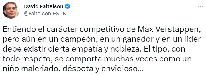 “Entiendo el carácter competitivo de Max Verstappen, pero aun en un campeón, en un ganador y en un líder debe existir cierta empatía y nobleza. El tipo, con todo respeto, se comporta muchas veces como un niño malcriado, déspota y envidioso…”, escribió a través de su Twitter.
